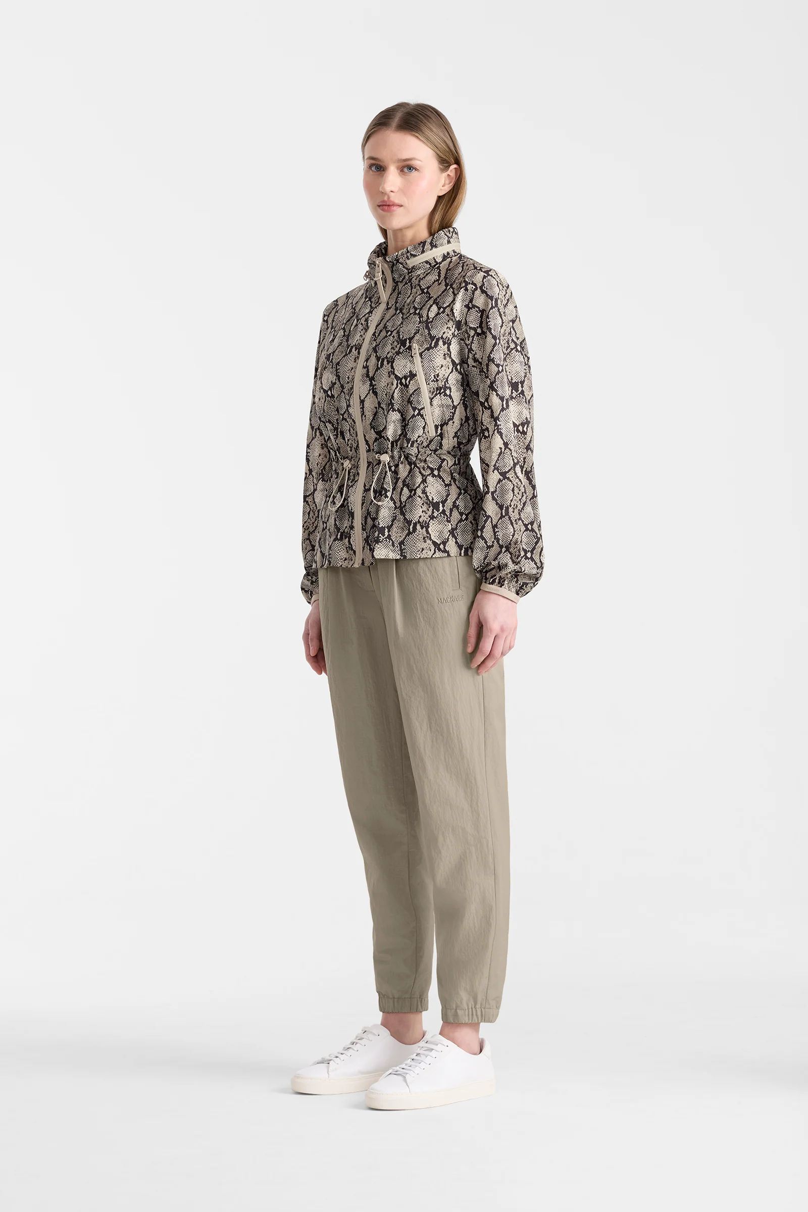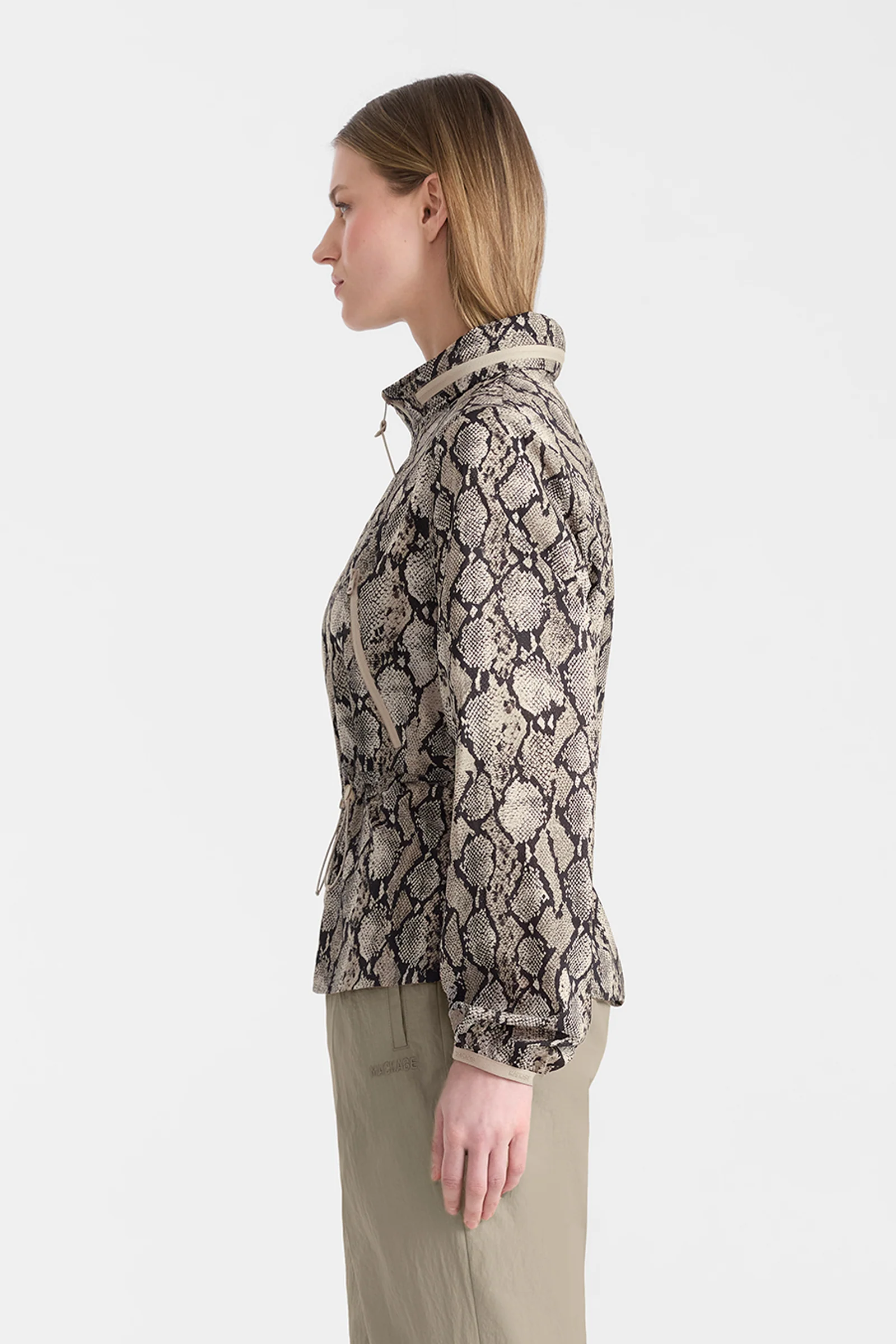 ROXY-PR is a rain jacket made from lightweight soft crinkle fabric with a bold snake pattern throughout. Water-repellent, windproof, and breathable protection, it features a stand collar with a packable hood, a drawcord waist for adjustable shape, and underarm eyelets for ventilation. Zippered chest and waist pockets add extra storage. The tonal MACKAGE silicone logo at the hem completes this refined technical silhouette.