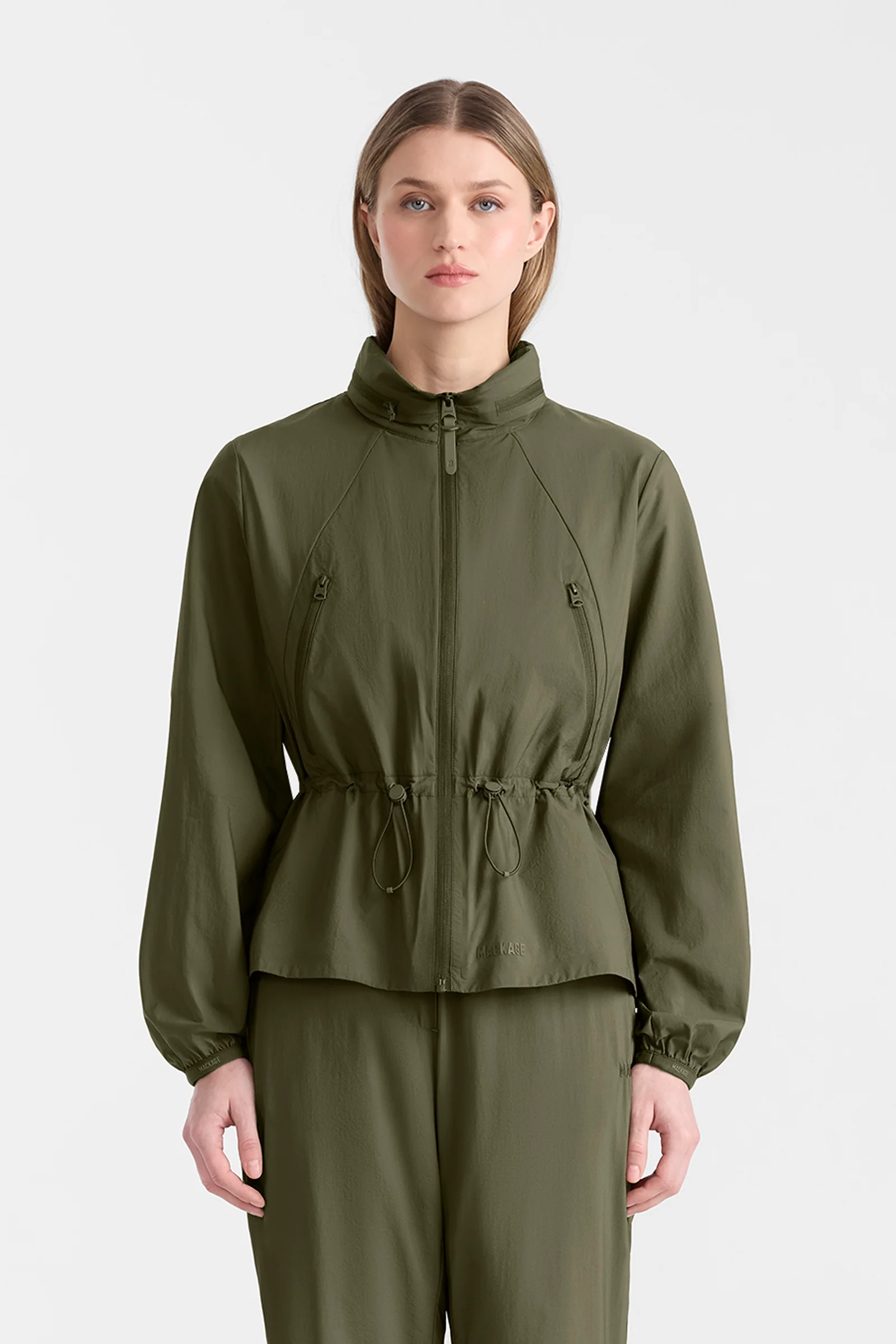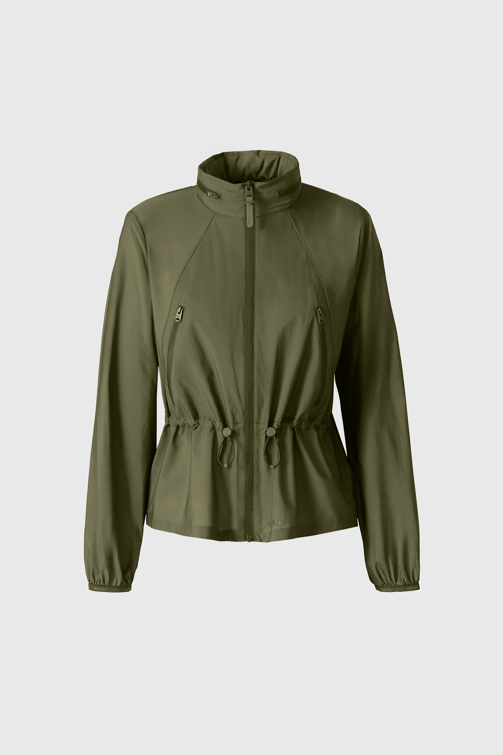 ROXY-SC is a rain jacket made from lightweight soft crinkle fabric with water-repellent, windproof, and breathable protection. It features a stand collar with a packable hood, a drawcord waist for adjustable shape, and underarm eyelets for ventilation. Seam-sealed construction ensures full weather resistance, while zippered chest and waist pockets add function and modern edge. The tonal MACKAGE silicone logo at the hem completes this refined technical silhouette.